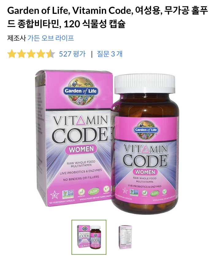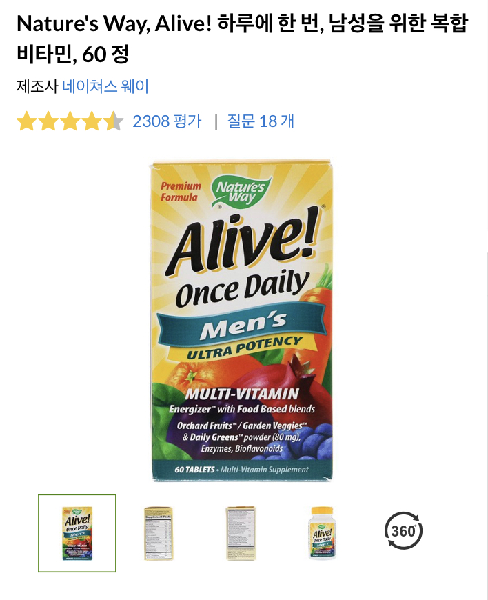 필요한 비타민은 다 들어있다. Nature’s way 제품보다 비타민 종류는 훨씬 다양하다. 비타민 A,C,D,E,K,B1,B,B6,B12 바이오틴.. 함량은 조금 딸린다. 물론 하루 섭취권장량 보다는 많다.