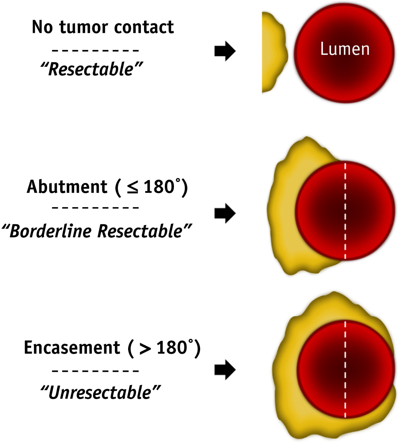 이 중 2. boderline resectable pancreatic cancer는 췌장 근처의 큰 동맥인 대동맥이나 상장간동맥(superior mesenteric artery), 상장간정맥(superior mesenteric vein)을 180도 이내로 침범 한 경우에 해당합니다. 만약 180도 이상으로 침범한 경우라면 3으로 보아서 수술이 불가능합니다.